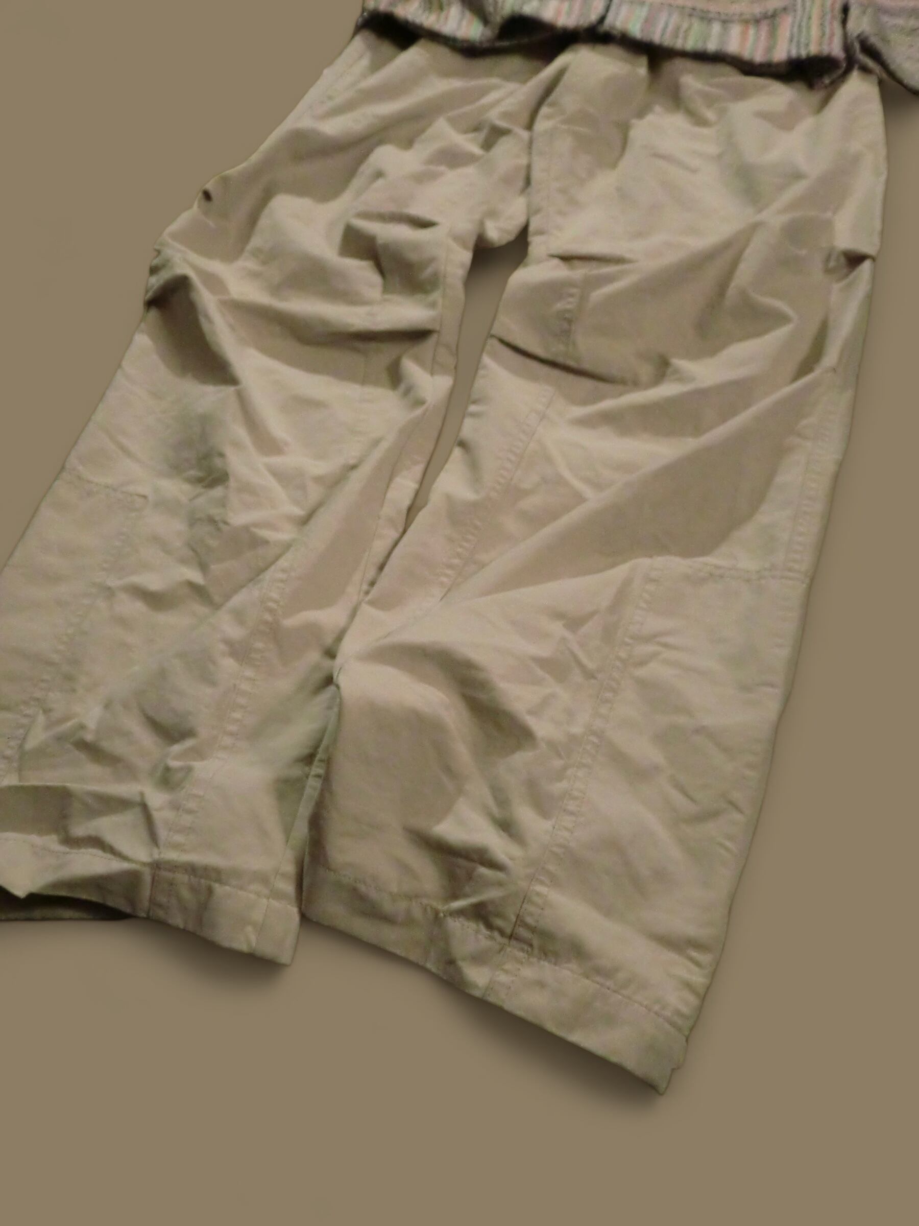 ユニークな短丈パーカーにポールスミスのホワイトカーゴパンツを合わせたセットアイテムとなっております。ドローコードつきのカーゴパンツはシルエットも抜群で機能性にも富んでいる優れものです。近年流行りのテック系コーデに挑戦してみたい方、ぜひこの機会にいかがでしょうか。